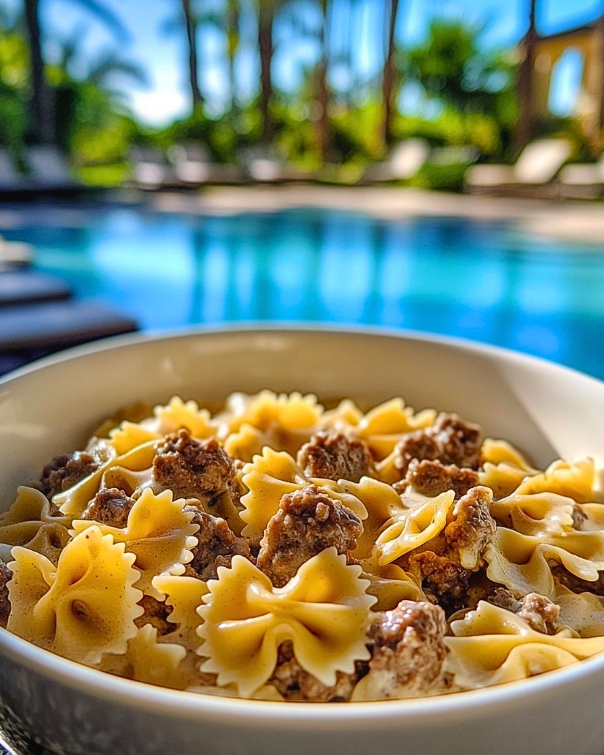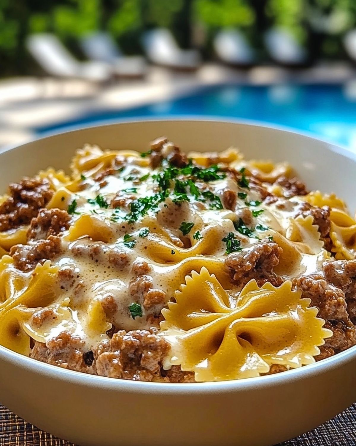 Beef and Bowtie Pasta with Alfredo Sauce is the kind of comfort food that brings together creamy richness and hearty satisfaction in one simple dish. This meal blends savory ground beef with tender bowtie pasta (farfalle) and smothers it all in a luscious Alfredo sauce that clings to every curve. Whether you’re serving it up poolside or making a cozy weeknight dinner, this creamy beef pasta delivers bold flavor with minimal fuss.